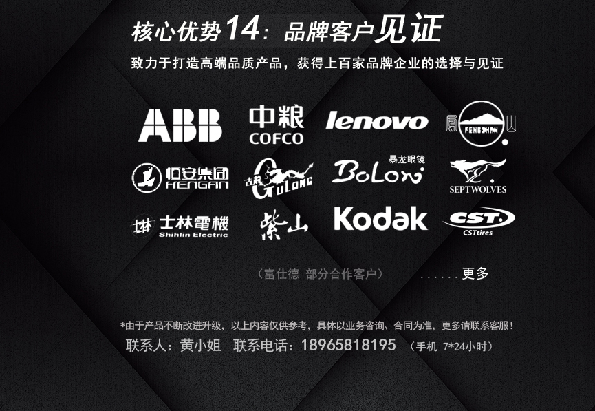 聯想、ABB、九牧、 萬利達、CST、古龍罐頭、七匹狼、 正浩食品、紫山、中糧、宏發(fā)股份、暴龍眼鏡、士林電機、海堤、恒安、冠林、路達國際、海晟連鎖、鳳山安溪鉄觀音、正新輪胎、圣莉雅壁紙、百得(廈門)等。