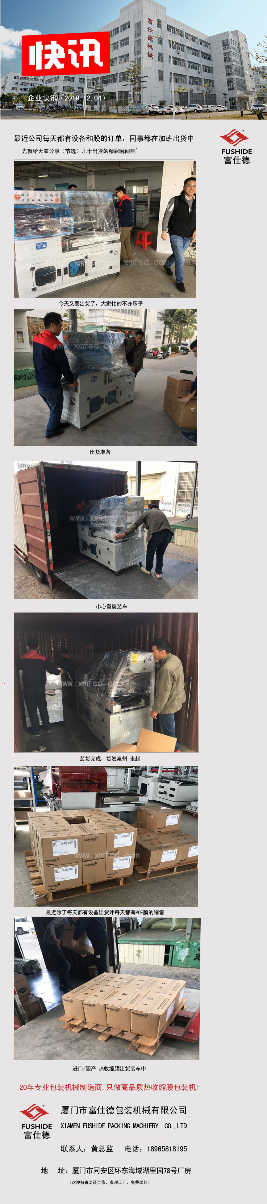 富仕德包裝機械公司坐落于廈門市,創(chuàng)建于一九九八年,是一家專業(yè)從事科研、設計、制造和銷售熱收縮機,熱收縮包裝機,熱收縮膜包裝機,全自動熱收縮包裝機,全自動熱收縮膜包裝機為一體的實業(yè)公司,生產(chǎn)多個系列的包裝機械產(chǎn)品:包括熱收縮機,全自動熱收縮包裝機,熱收縮包裝機,全自動熱收縮膜包裝機,熱收縮膜機,熱收縮膜,收縮膜包裝機,熱收縮膜機,食品包裝機,茶葉包裝機,多功能包裝機,全自動包裝機,開箱機,封箱機,包裝材料,POF熱收縮膜等,客戶遍布全國各地和海外地區(qū),其中福建本地客戶主要集中在廈門、泉州、漳州、福州、莆田等,公司定位于設計制造中高端的全自動熱收縮膜包裝機械:包括食品包裝機、陶瓷包裝機、茶葉包裝機、壁紙包裝機、濾芯包裝機、飲料包裝機、衛(wèi)浴包裝機、日化產(chǎn)品包裝機、電子包裝機、五金包裝機、橡膠制品包裝機、墻紙包裝機、膠帶包裝機、化妝品包裝機、保健品包裝機、印刷品包裝機、彩盒包裝機、圓柱體包裝機、餐具包裝機、家居用品包裝機、瑜伽墊包裝機等適應各行業(yè)不同形狀、單件、組合包裝產(chǎn)品;用于各行業(yè)產(chǎn)品的批量化包裝生產(chǎn);技術領先、制造精良,結(jié)實耐用; 我們具備廠家:從研發(fā)、生產(chǎn)、銷售、售后,以及穩(wěn)定的質(zhì)量和可控合理的價格等優(yōu)勢;公司擁有多項國家專利技術并通過歐盟CE認證,產(chǎn)品采用進口知名品牌核心部件等,經(jīng)過近20年專業(yè)研發(fā)、設計經(jīng)驗使得富仕德包裝機械產(chǎn)品更加卓越、穩(wěn)定、效率更高,更節(jié)約包材成本。